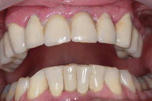 A 83 éves Páciensünk egy baleset során vesztette el jobb és bal oldali felső fogait, valamint az első konzultáció során elpanaszolta azt is, hogy nagyon elégedetlen megsárgult, lepedékes fogaival.