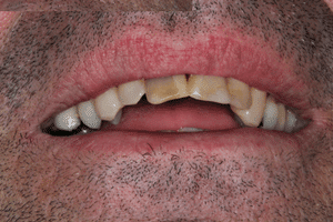 A 31 éves páciensünk sajnálatos módon évek óta elhanyagolta a szájhigiéniát, ami miatt már nagyon fiatalon több fogát el kellett távolítani. Ettől elveszítette önbizalmát és önbecsülését is.