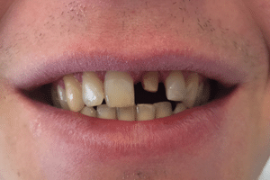 Paciensünk, akinek egy baleset következtében az első fogai annyira megsérültek, hogy az idegek is kilátszottak.